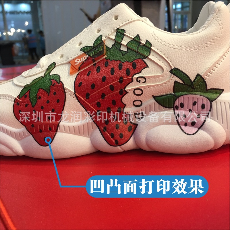 龍潤LR-2513 uv打印機(jī)實(shí)現(xiàn)從2.5毫米打印距離到2.5厘米打印距離的,直接打印高弧度,實(shí)現(xiàn)uv打印高弧面,uv打印異形,uv打印鞋面,uv打印凹凸面,uv打印玩具等高落差產(chǎn)品,無需制版,直接打印。2513UV高落差平板噴墨打印機(jī)是針對鞋子/鞋材行業(yè)的專用機(jī)型,其有高落差、高噴射、打印精度高、質(zhì)量好、色彩鮮艷、打印速度快、圖案清晰亮麗、不掉色等特點(diǎn)。打印落差25mm不飛墨,打印方便,無需制版,只要有圖片,連接一臺(tái)電腦就可以直接在成品鞋或者鞋材上面印刷自己想要的3D圖案。因?yàn)樵O(shè)備針對不同客戶,不同行業(yè),所以在機(jī)器配置和機(jī)器大小選購方面存在差異,價(jià)格也高低不一,客戶在購買機(jī)器前務(wù)必要咨詢銷售人員,我們才能推薦適合您的機(jī)器。