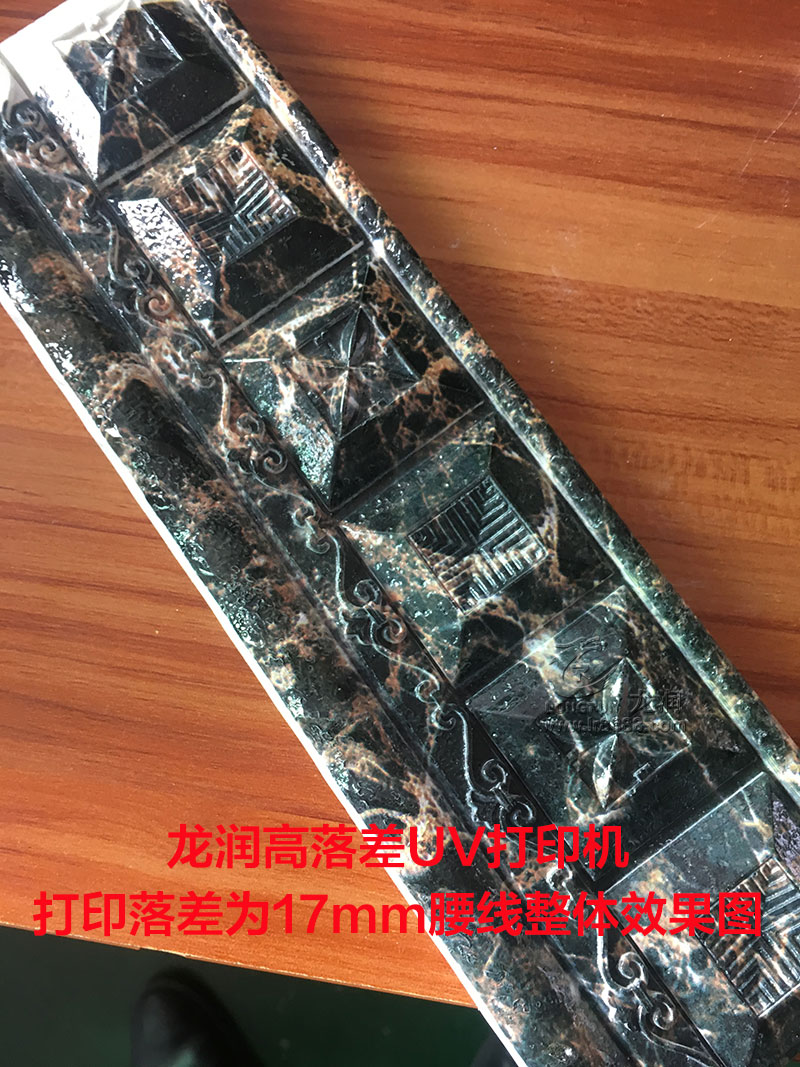 我們隨機(jī)抽取了一塊樣品進(jìn)行打印,打印出來(lái)后整體效果還算滿意,客戶也能認(rèn)可,然而我們那尺子測(cè)量該腰線的落差高度,才知道該腰線落差高度已經(jīng)達(dá)到了17mm,比我們之前測(cè)試的15mm樣品還要高2mm,然而看細(xì)節(jié),發(fā)虛并不嚴(yán)重,也沒(méi)有嚴(yán)重飛墨的情況出現(xiàn),整體效果已經(jīng)是能達(dá)到客戶的需求。
